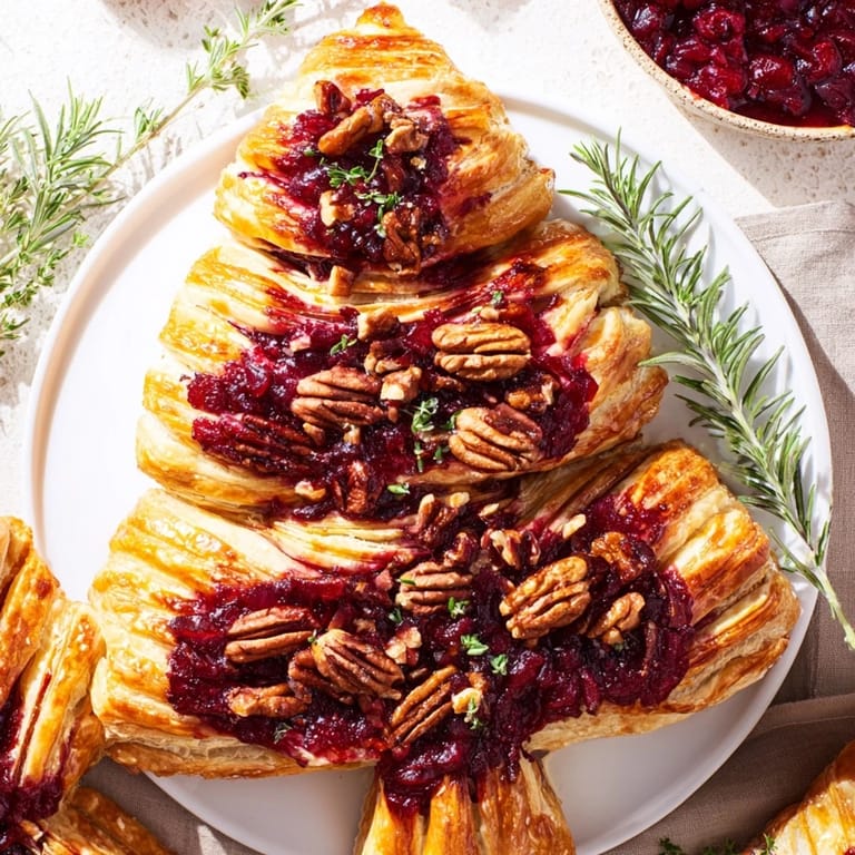 Pin it A festive, elegantly wrapped brie cheese, baked in golden puff pastry shaped like a pine tree, filled with cranberry sauce and toasted pecans—perfect for holiday gatherings.