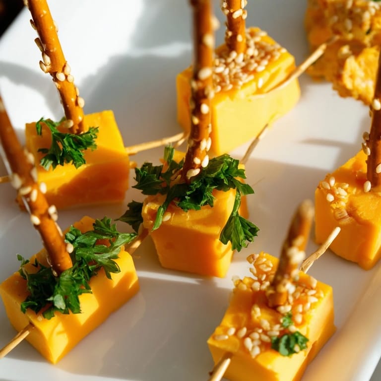 Pin it A festive, bite-sized party snack featuring sharp cheddar cheese cubes skewered on crispy pretzel sticks, perfect for ringing in the New Year.