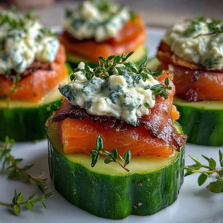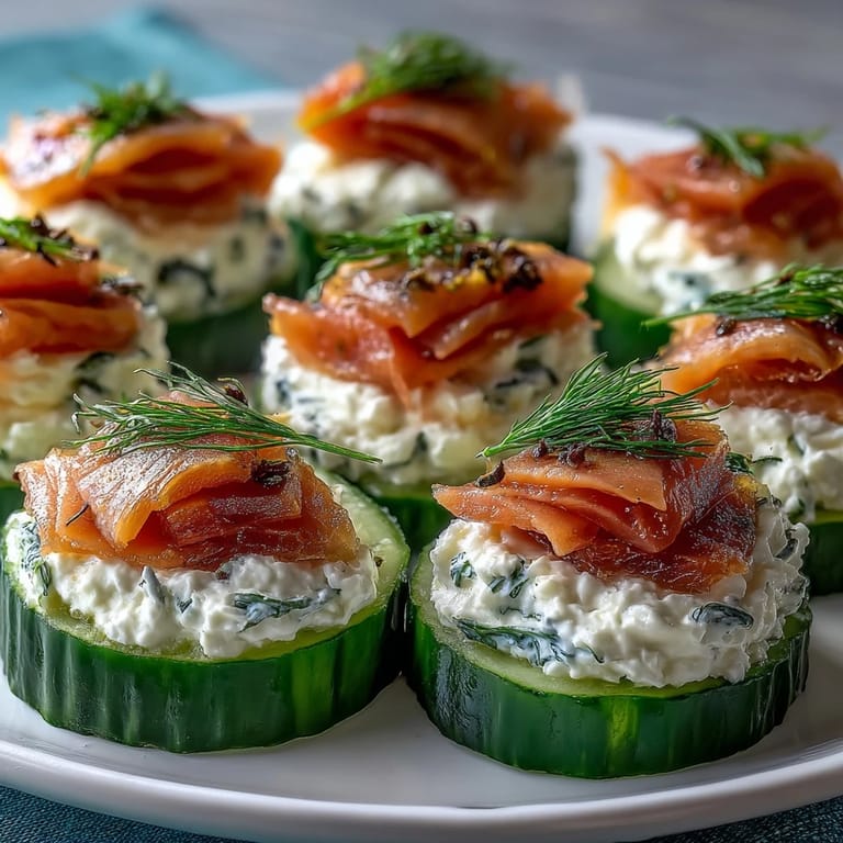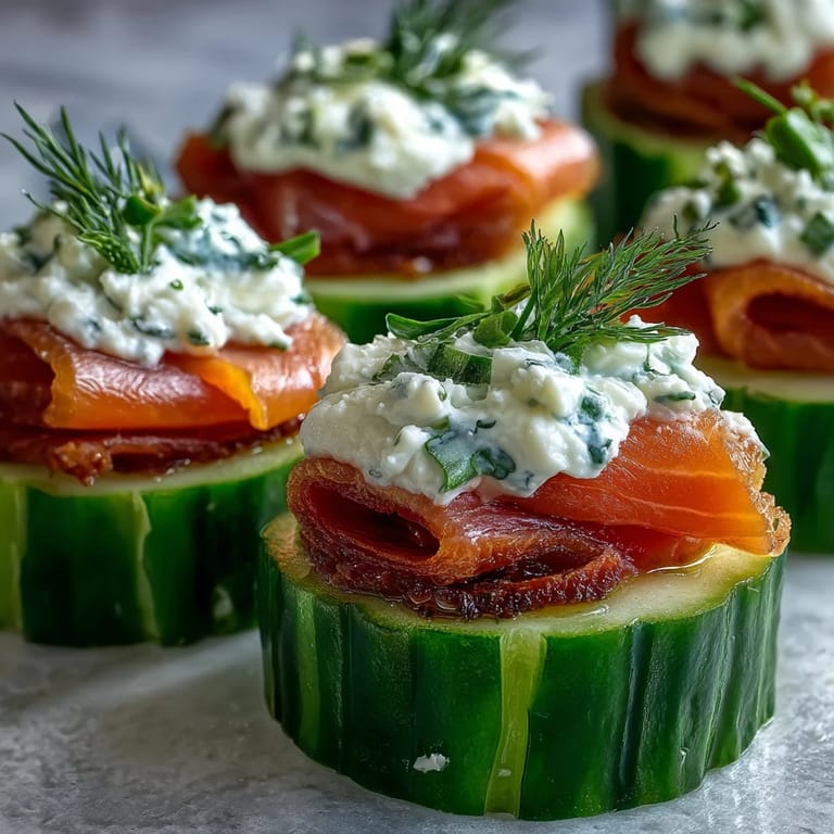 Pin it There's something about the simplicity of cucumber bites that caught me off guard during a dinner party last summer. A friend had brought smoked salmon, and I found myself standing in the kitchen with barely twenty minutes before guests arrived, wondering how to make something that felt both effortless and impressive. These little rounds became my secret weapon that night—no cooking required, just fresh ingredients coming together in a way that made everyone pause mid-conversation to ask for the recipe.