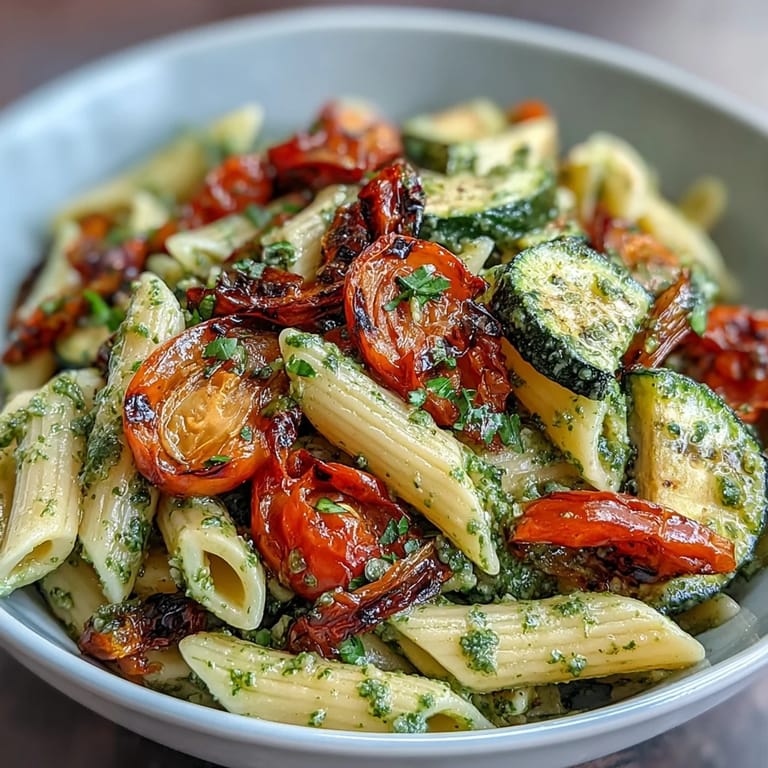 Pin it There's something about the smell of roasting vegetables that fills a kitchen with promise. I stumbled onto this pasta combination on an ordinary Tuesday when my farmers market haul was threatening to wilt, and I needed something that would let each vegetable shine without fussing. The pesto became the glue that held everything together, turning what could have been a simple side dish into something I found myself craving all week.