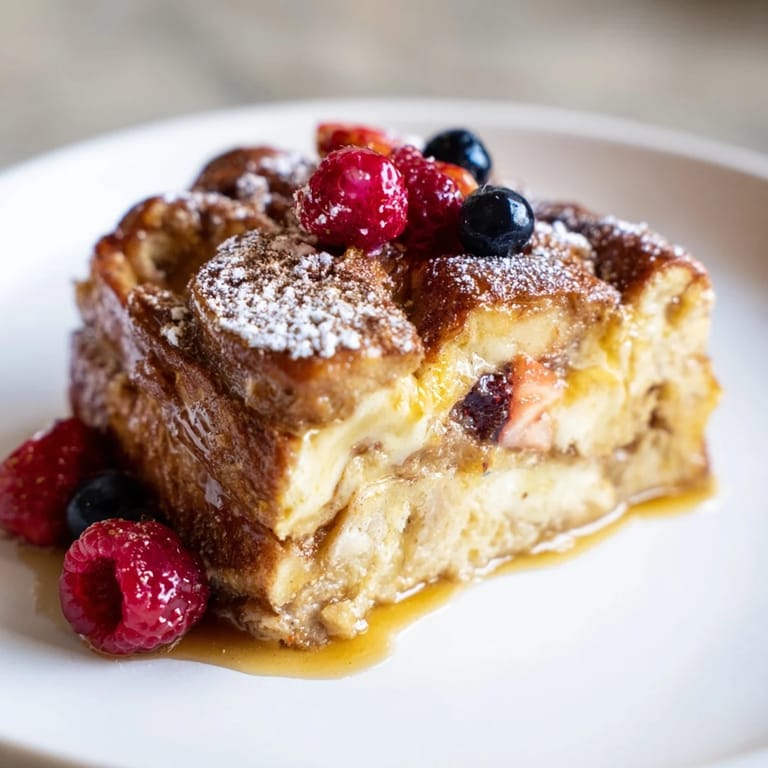 Pin it A comforting, custardy baked French toast infused with warm spices, perfect for easy weeknight dinners or a relaxed weekend breakfast treat.