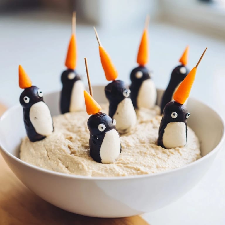 Pin it Winter Dip: White Bean Dip with Olive Penguin Decoration A creamy, savory white bean dip perfect for winter gatherings, adorned with adorable olive penguin decorations for a festive touch.